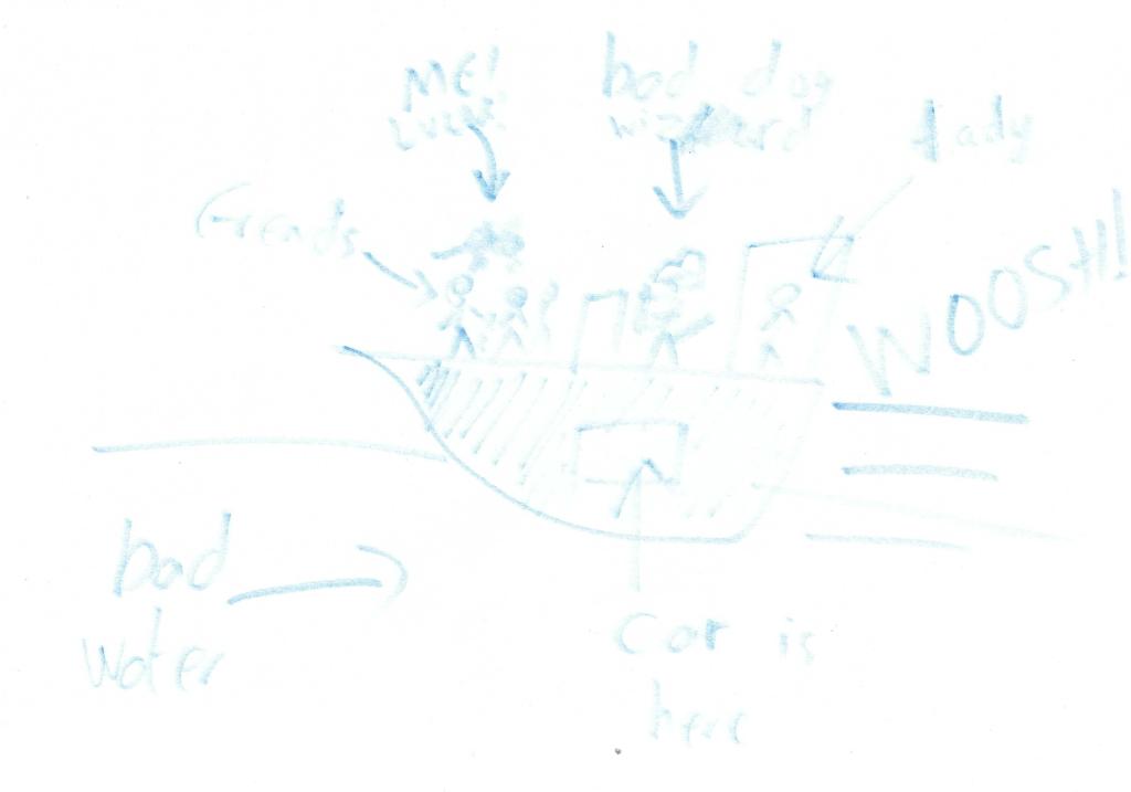 When the Big Special Boat was fixed, Leofric and Hinnerk went to bring ‘Erno The Car down from the cliff. They took two of the monsters with them and the other monster stayed on the Big Special Boat with the Bad Dog Wizard. The Bad Dog Wizard is very mean: he has a nice lady in his cabin and she cannot think very well, like me, but instead of being her friend and giving her hugs and letting her ride on his shoulder like my friends do for me, he keeps her locked in his cabin and threatens to hurt her if my friends don’t help with the boat. He is very mean and I do not like him.