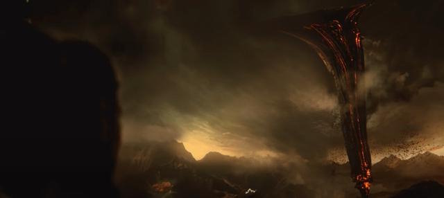 Floating slowly across the sky, graceful except that the sandy air itself whips around as if it resents its presence, crawls an impossibly large vessel of infernal iron. Shaped like the fang of some fierce beast, its tip narrowly avoids grazing the tops of the taller hills as its broad head reaches up far above the whirling sands. Conduits of magical red fire blaze upwards along its length, and bolts of electrical energy arc out along its lower surfaces.