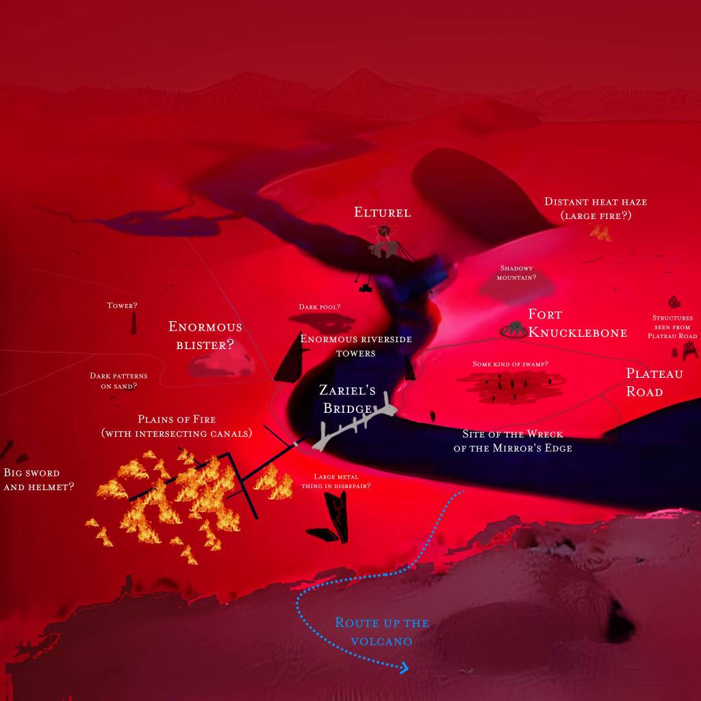 Here and there towers dot the landscape, especially around the mighty span of Zariel’s Bridge, contra-Abyss from where the party crossed the channel aboard the Mirror’s Edge. Similarly, still visible are the plains of fire and the enormous blister-shaped hill behind them.